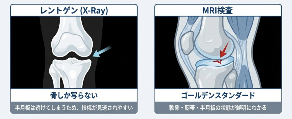 レントゲンは「骨」を映し出すのには適していますが、軟骨の一部である半月板は透けてしまい、映りません。そのため、重度の損傷があってもレントゲン画像だけでは見落とされてしまうのです。