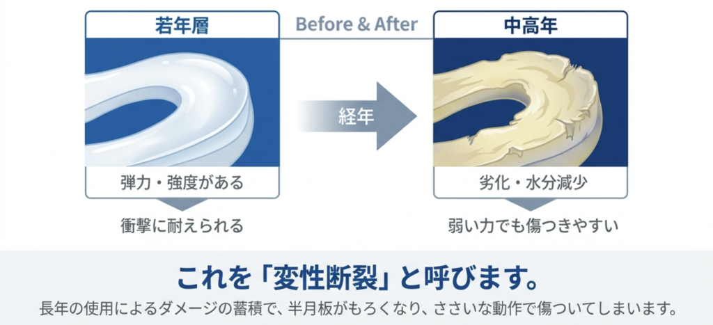 膝のクッションである半月板は、「線維軟骨(せんいなんこつ)」という組織でできています。この組織は本来、押しつぶす力や引っ張る力に強い優れた強度を持っていますが、年齢とともに水分量や柔軟性が失われ、少しずつ劣化していきます。