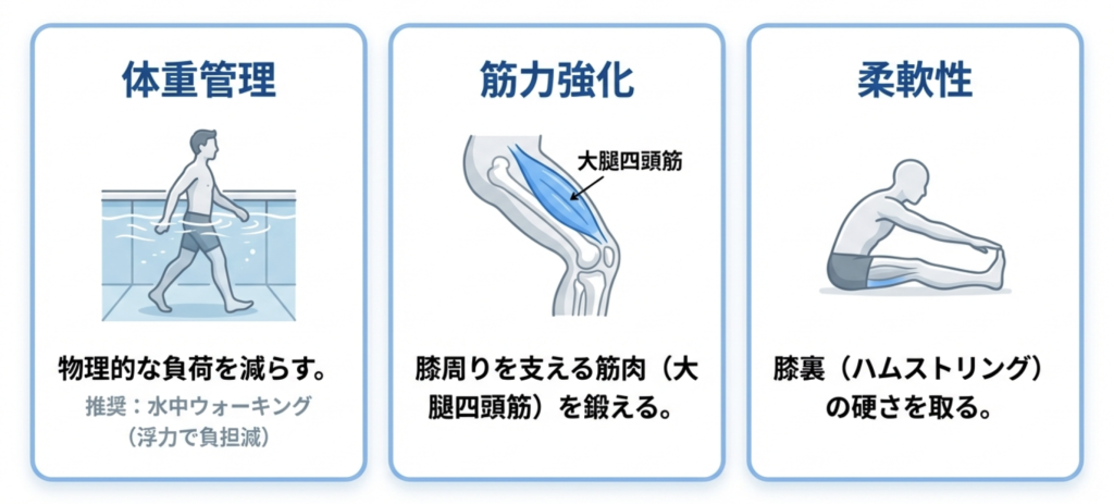 特に中高年の場合、手術をしたグループと、手術をせずに運動療法(保存療法)を行ったグループで、治療成績に大きな差がなかったという研究結果が示されています。膝が完全に動かなくなる「ロッキング」の状態でない限り、まずは運動療法を中心とした保存療法から始めるのが、現在の「推奨される順番」です。
