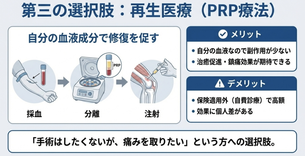 最新の治療選択肢として注目されているのが「PRP療法(再生療法)」です。
