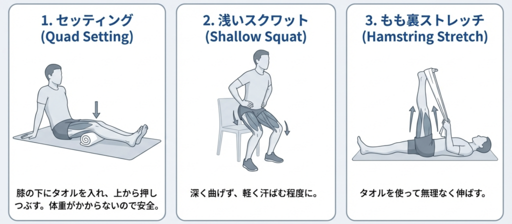 今日から始めてほしいのが、膝への負担が少ない「セッティング」という運動です。 やり方は簡単です。床に足を伸ばして座り、膝の下に丸めたバスタオルを置きます。そのタオルを膝の裏でギュッと床に押し付けるようにして、太ももの前側(大腿四頭筋)に力を入れます。これなら体重がかからないため、痛みがある方でも安全に筋力を鍛えられます。