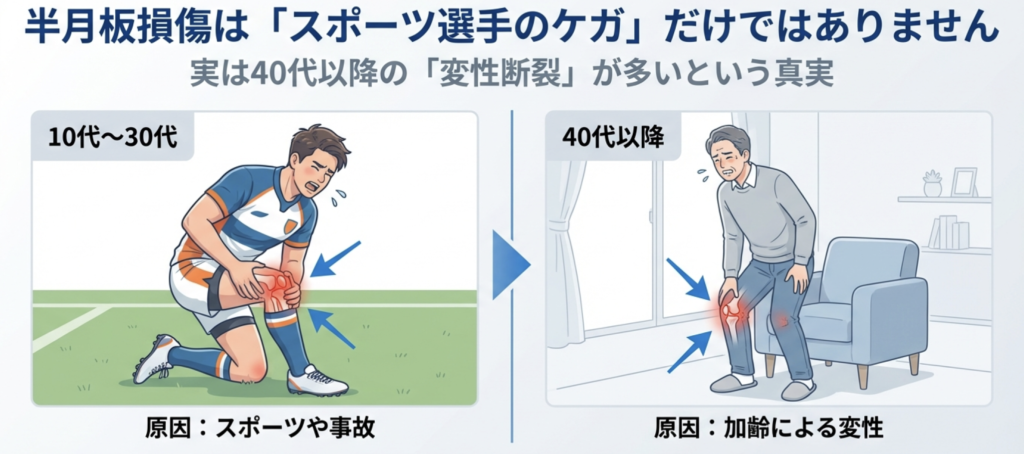 半月板損傷において、一般の方があまり知らない衝撃的な事実があります。それは、10〜30代の若者がスポーツで受傷するケースよりも、40代以降に加齢に伴って発生するケース(変性断裂)の方が圧倒的に多いということです。